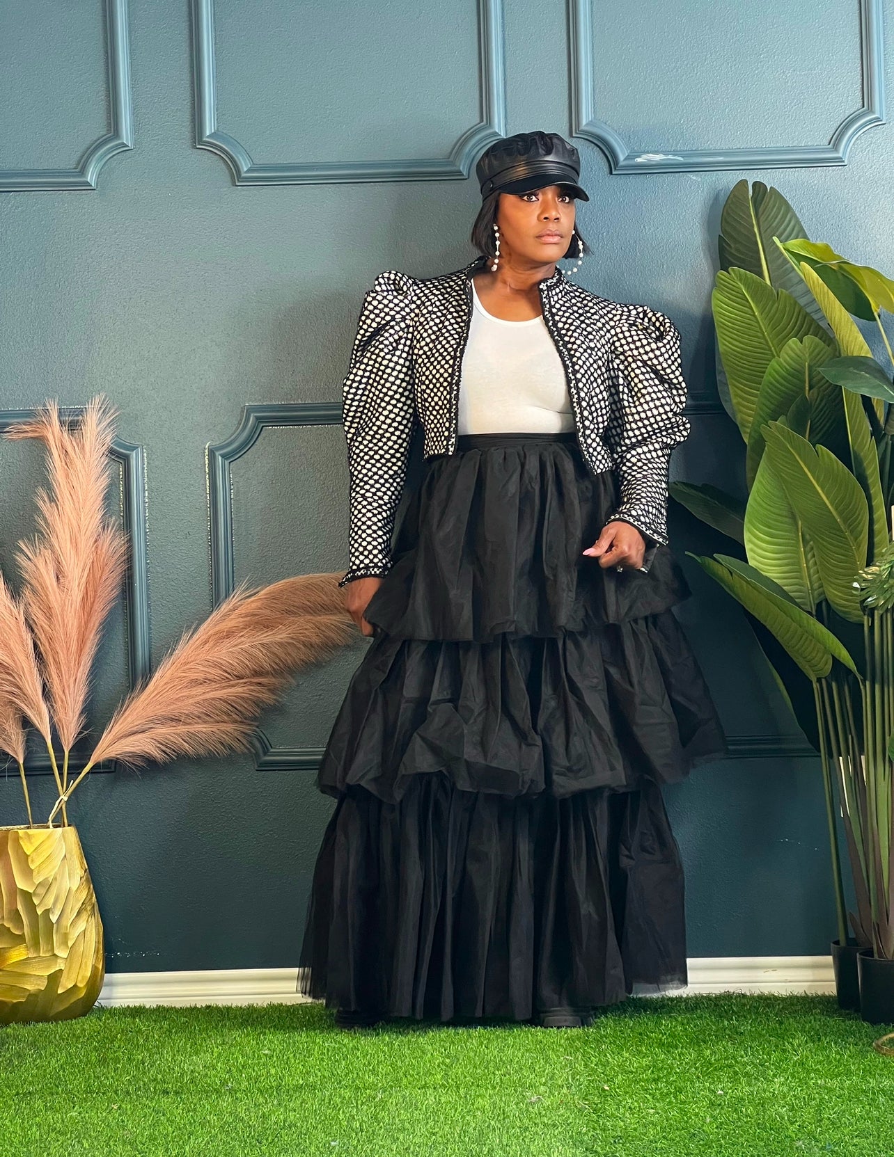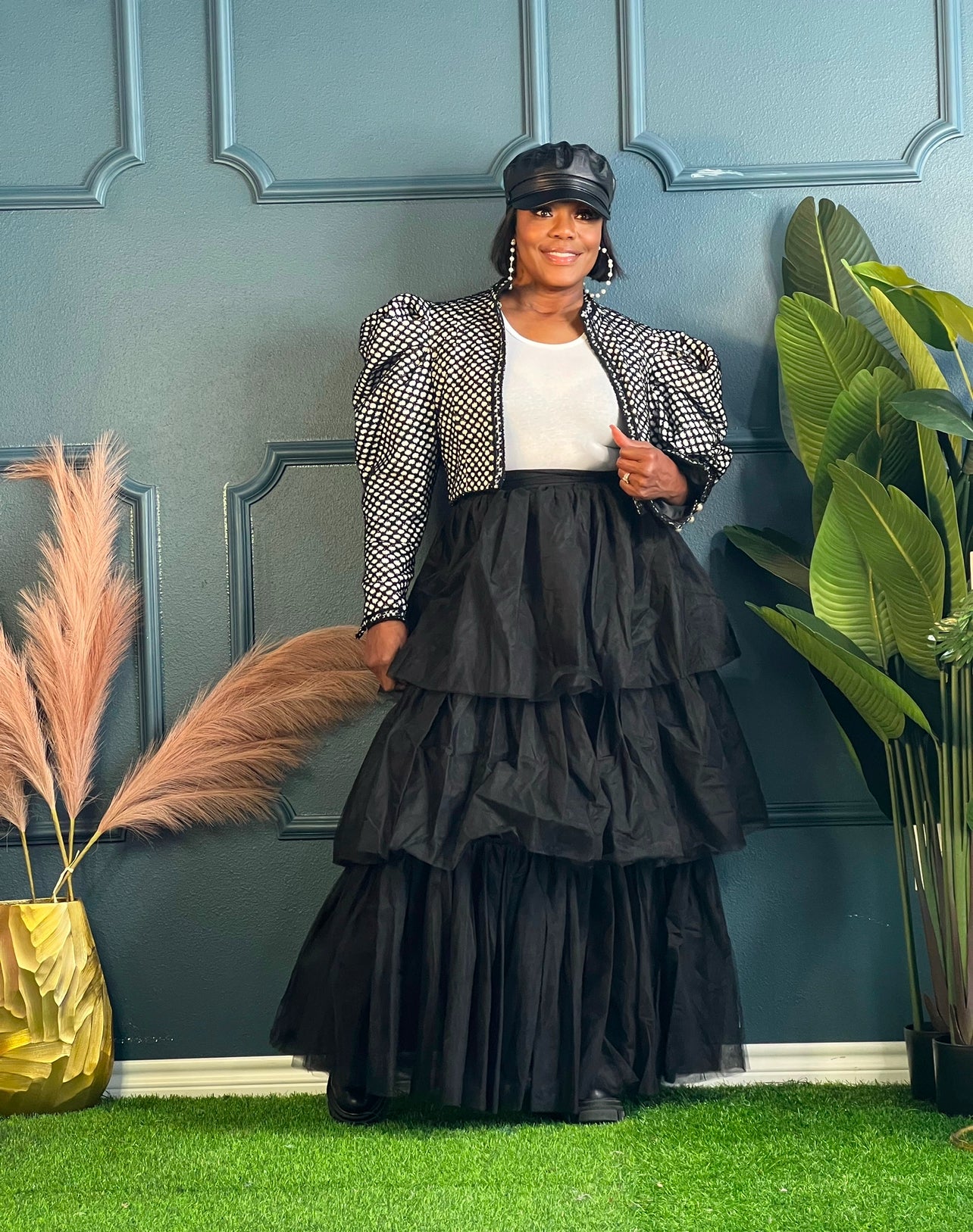 No stretch; side zipper at waist band; three layers of tulle; model is wearing medium