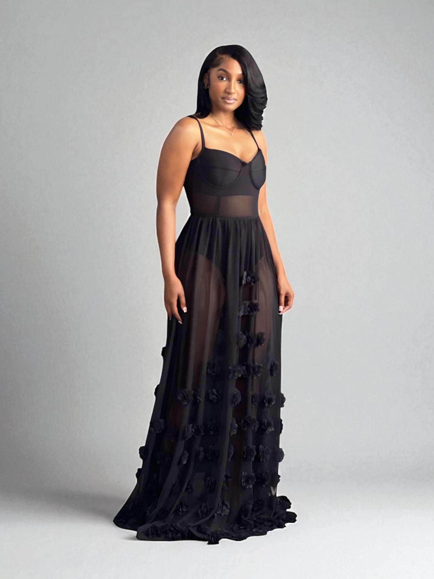 Some stretch; zipper back and padded bra area; bodysuit coverage with sheer bottom; model is 4’10 wearing small