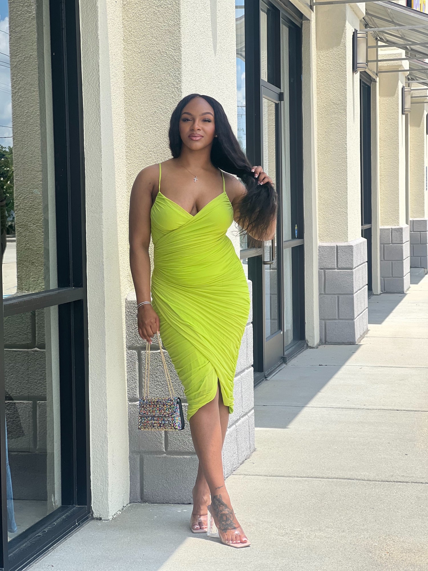 Stretch; zipper back; ruched; adjustable straps; model is 5’6 wearing medium