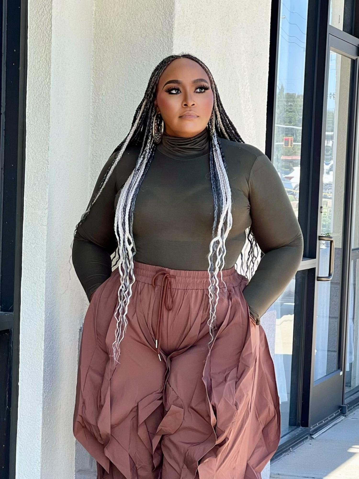 Stretch; soft chic fitted turtleneck; model is 5’7 wearing large