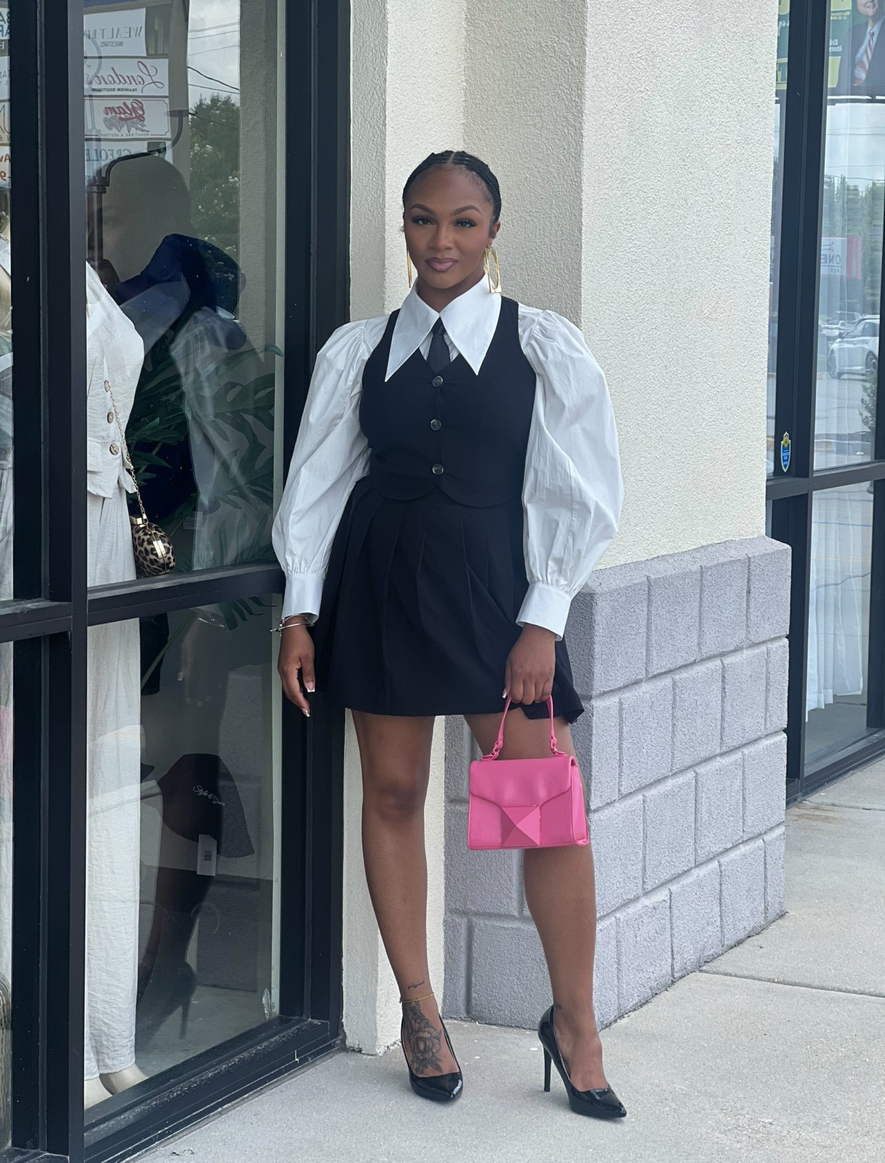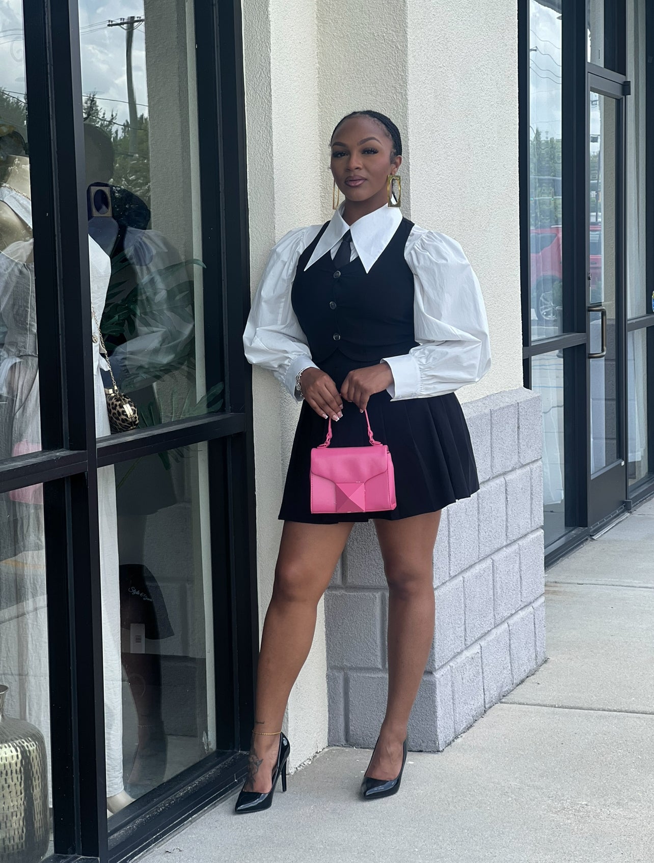 Stretch; button down vest with razorback; elastic band in waist of pleated skirt; model 5’6 wearing medium