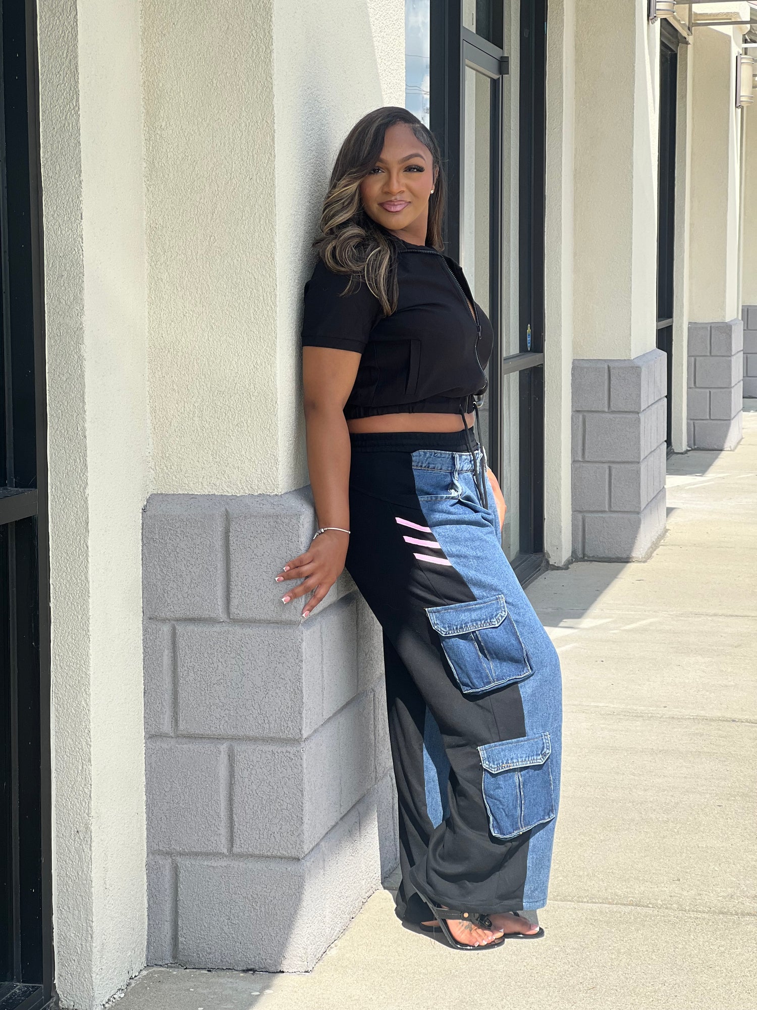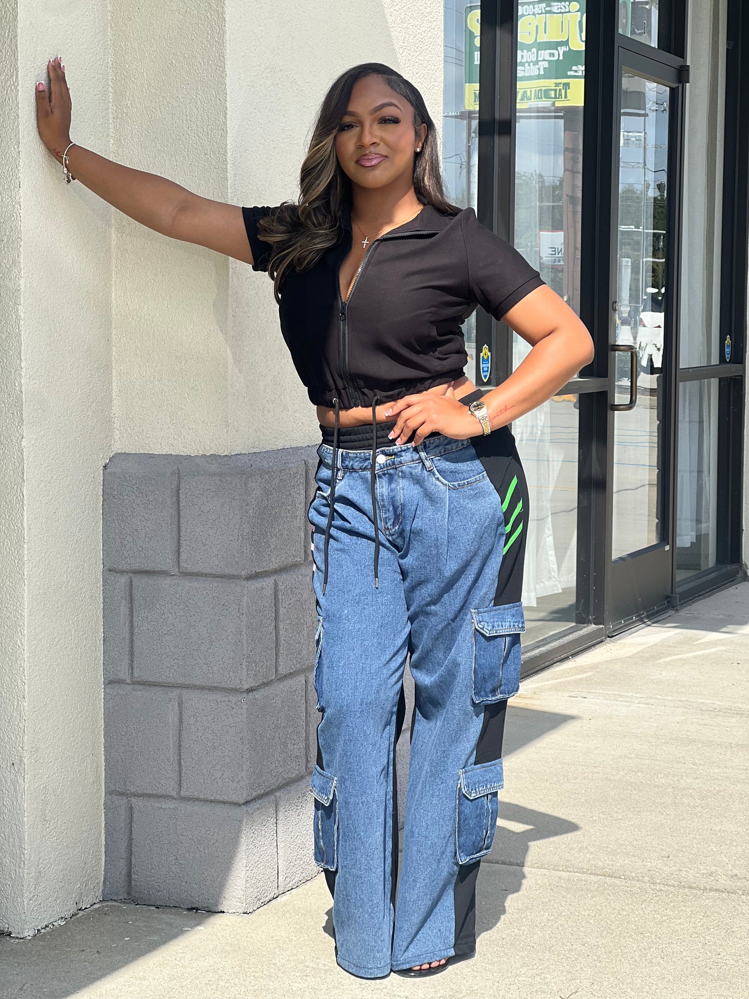 No stretch in jeans but stretch in back jogger fabric; pockets; wide leg cargo pockets