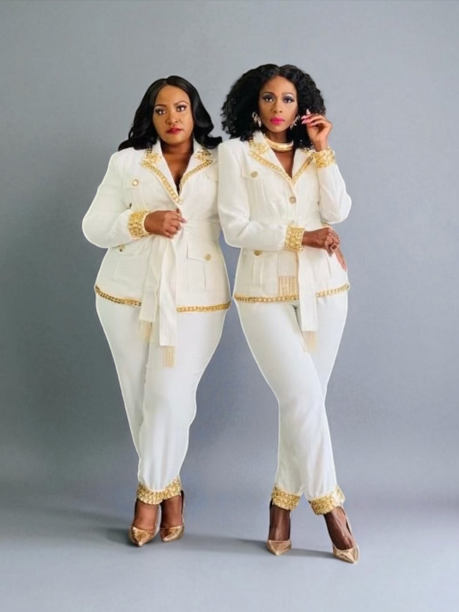 Very very little stretch; gold chain trim and embellishments; zipper at wrist and ankles; models are wearing a medium and a 1X