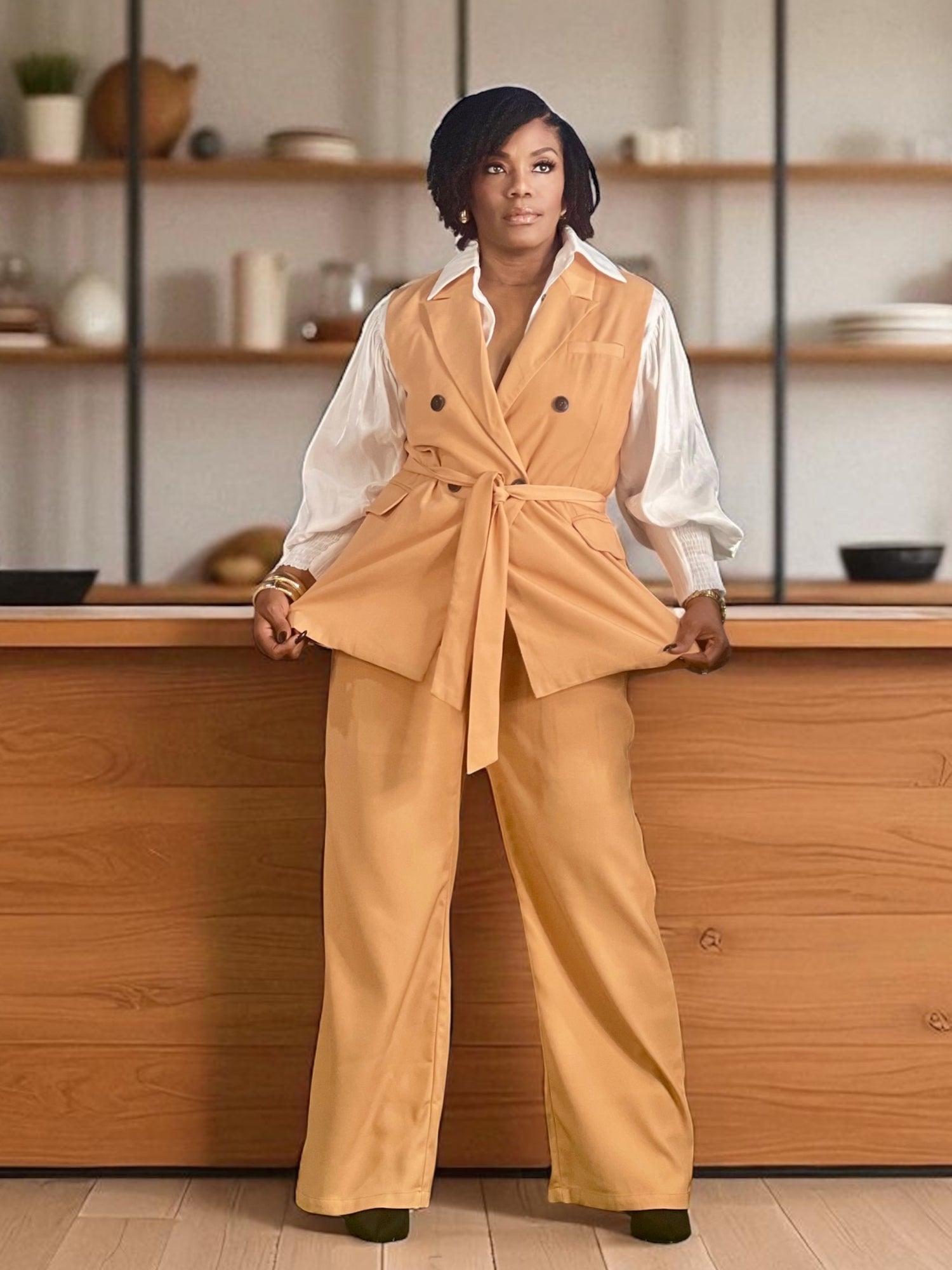 No stretch; oversized vest with buttons and tie belt; elastic back at waist in pants; pockets; BLOUSE SOLD SEPERATELY; model 5’4 wearing medium