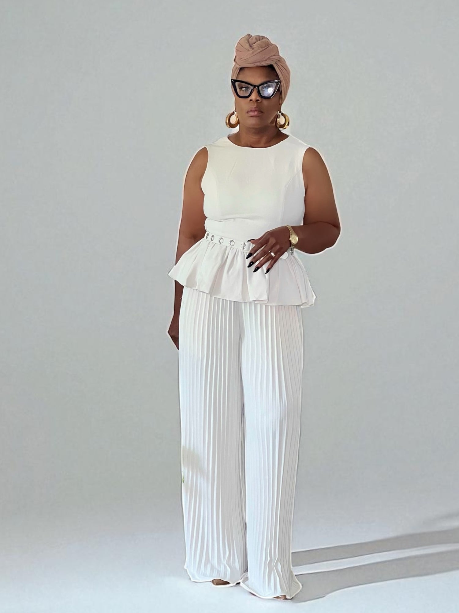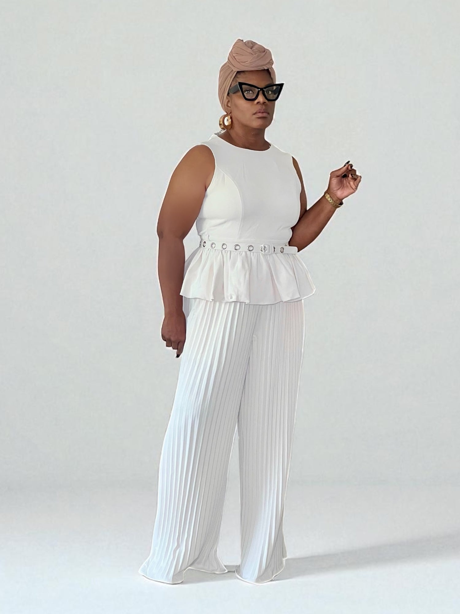 Little stretch; peplum top with upper back zipper and belt included; pull on elastic back waist in pants; pleats galore; model is 5’4 wearing medium