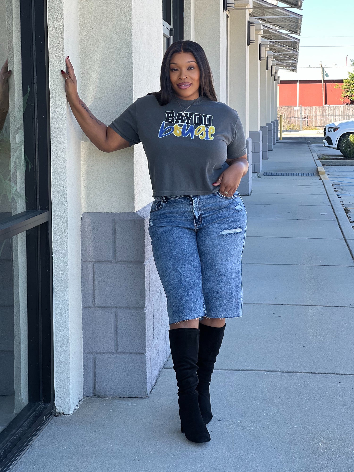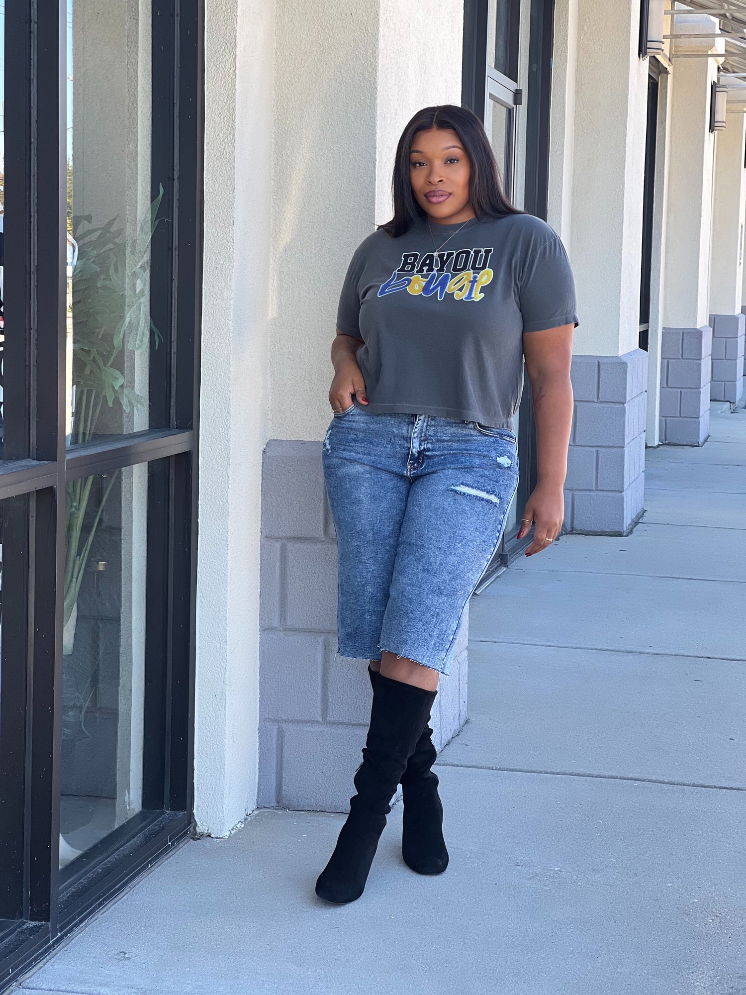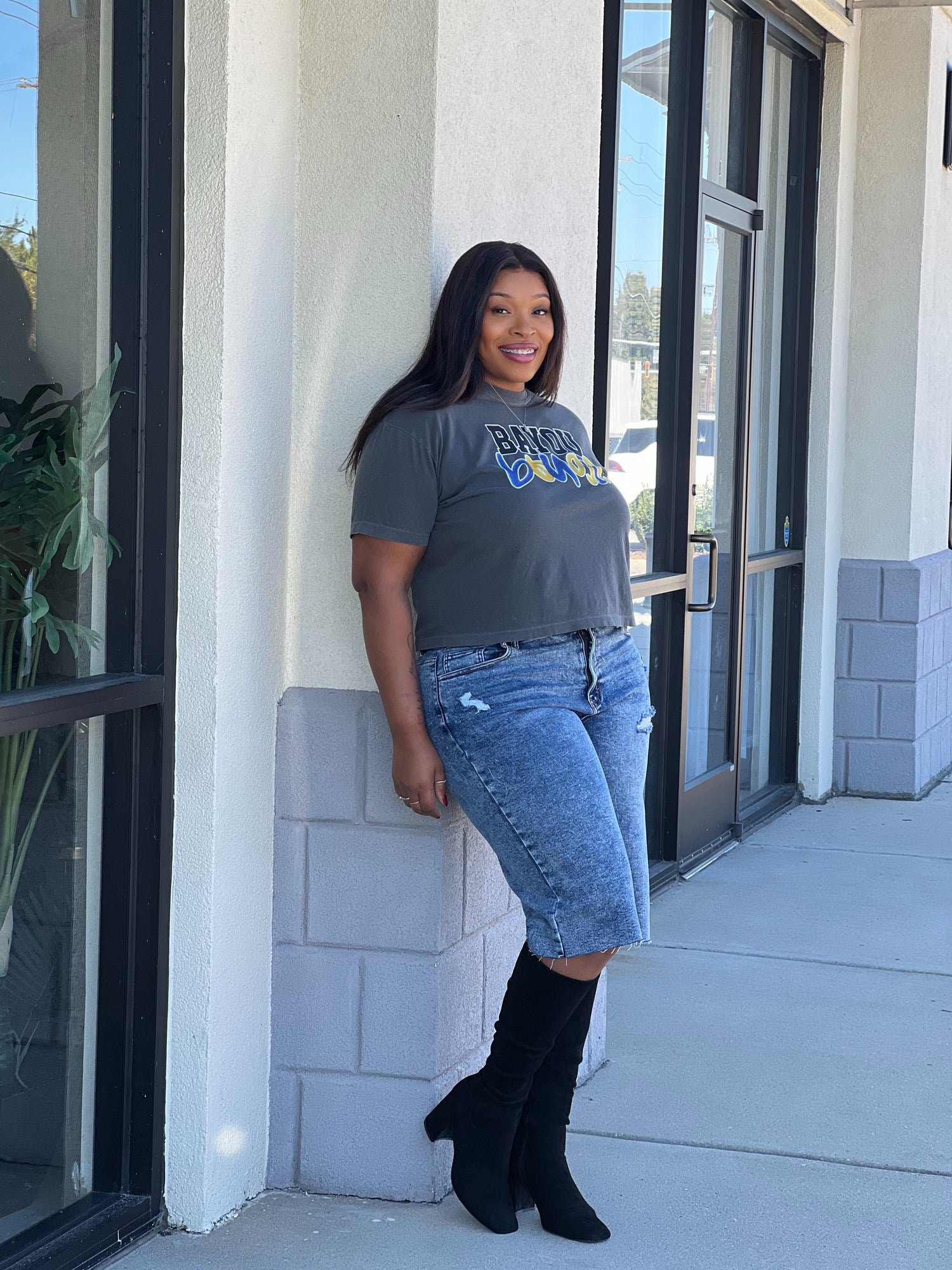 Stretch; knee length and pockets; model is 5’9 wearing large