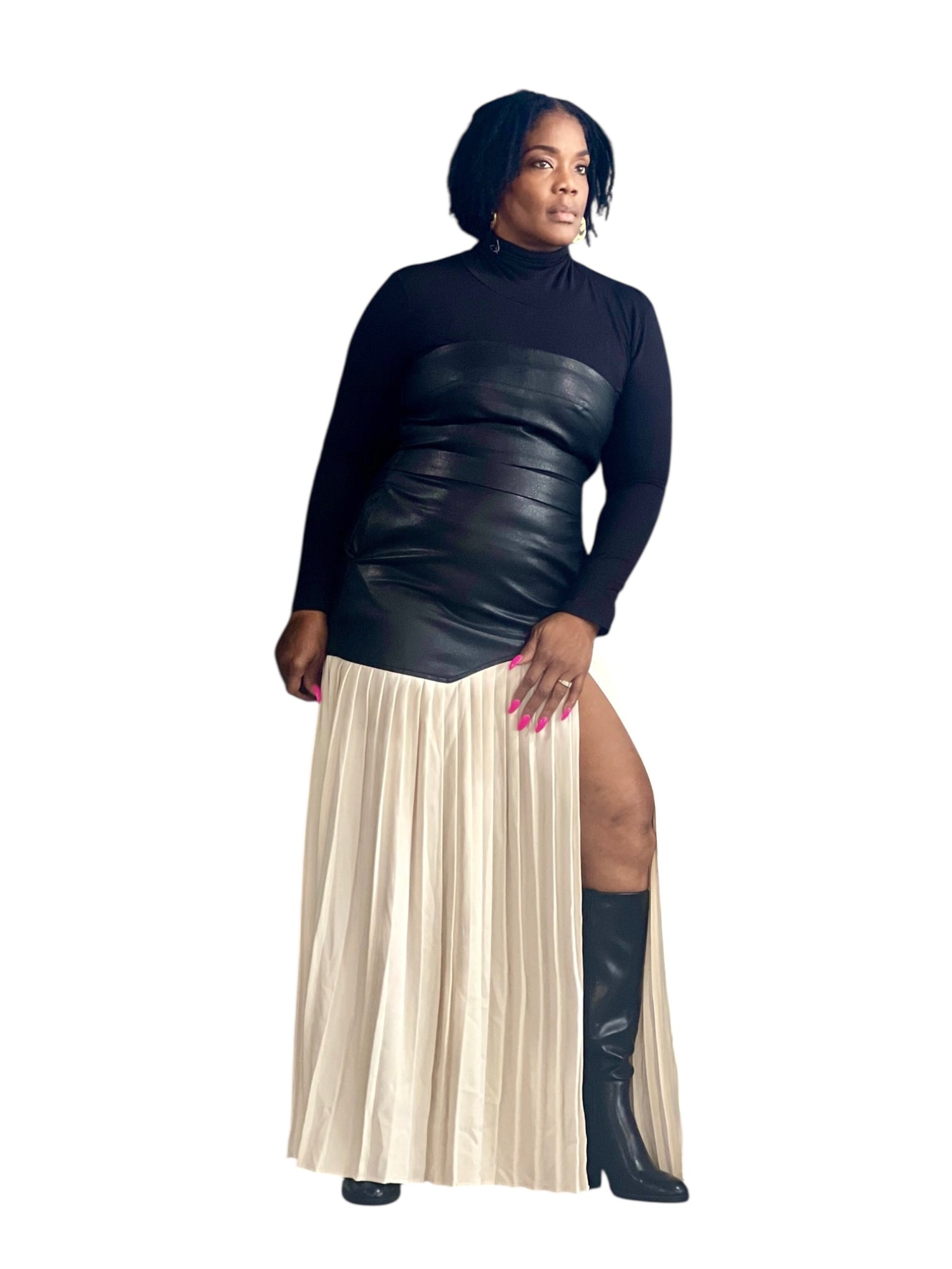 No stretch; elastic waist back in both pieces; zipper back; pockets in skirt; model is 4’10 wearing small