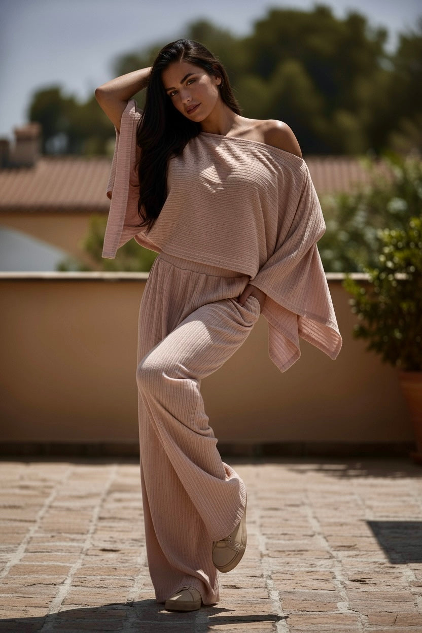 Stretch; pullover top with one button under the arm and elastic waist bottoms with pockets; crinkle fabric; good quality; model is wearing small