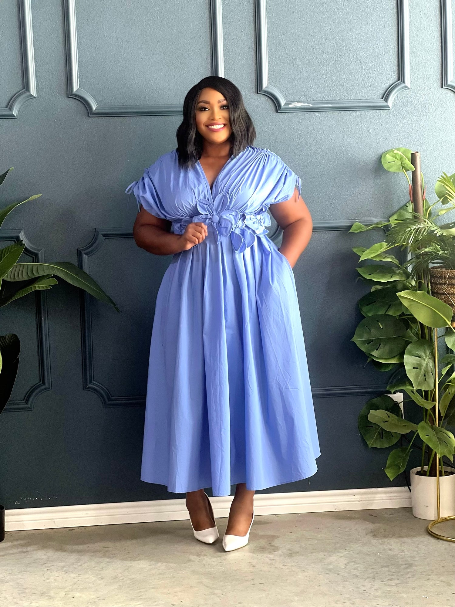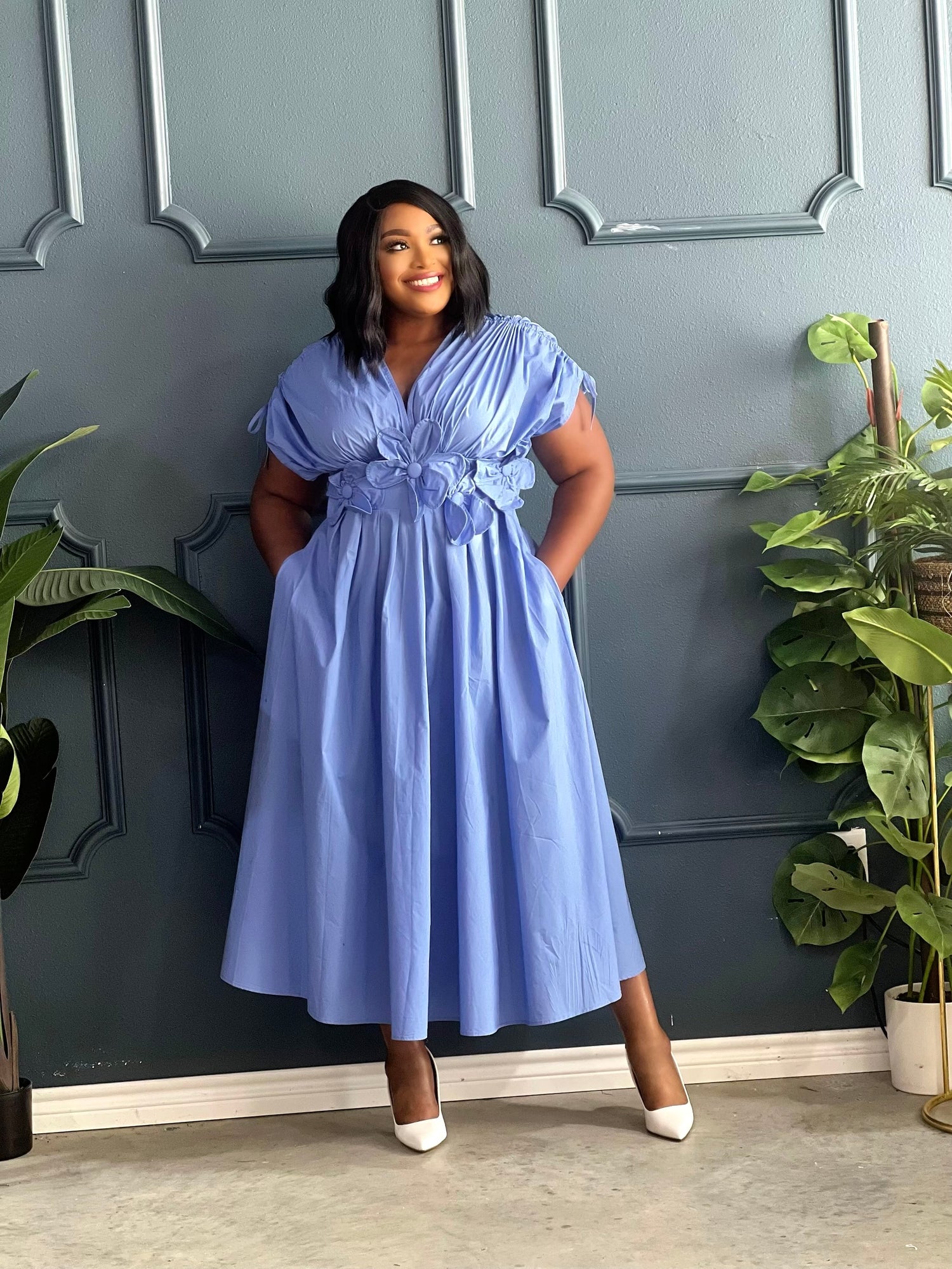 No stretch; elastic at the back along with zipper and low V; drawstring shoulders; pockets; model is 5’7 wearing 2X