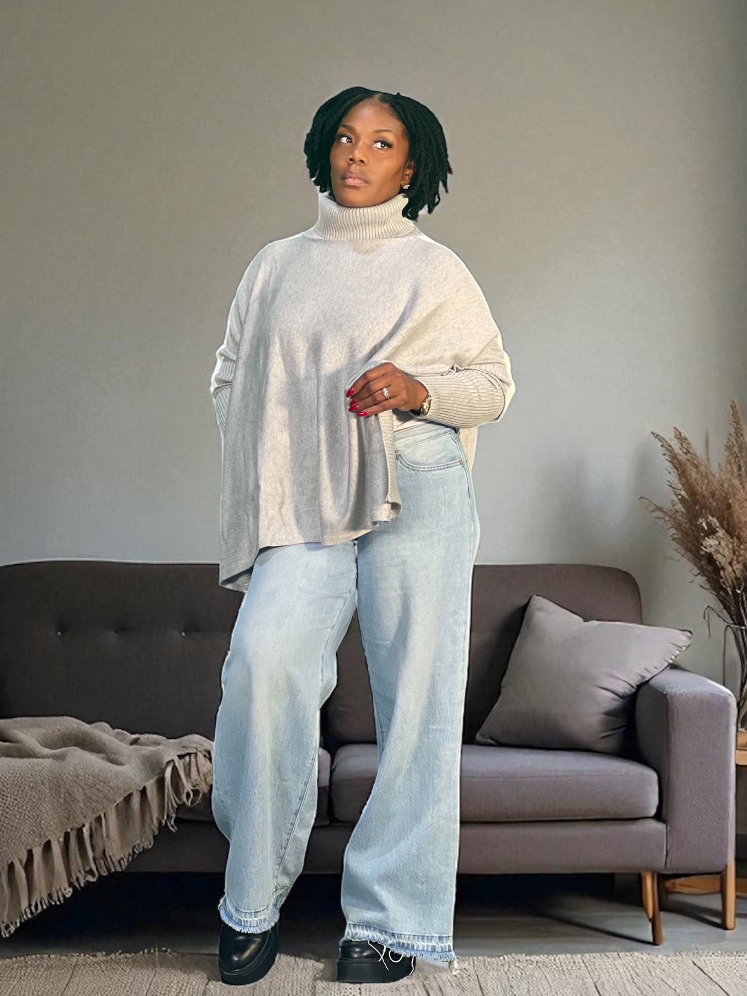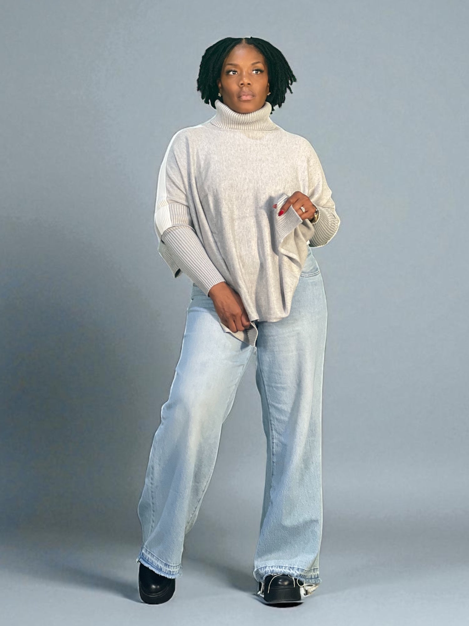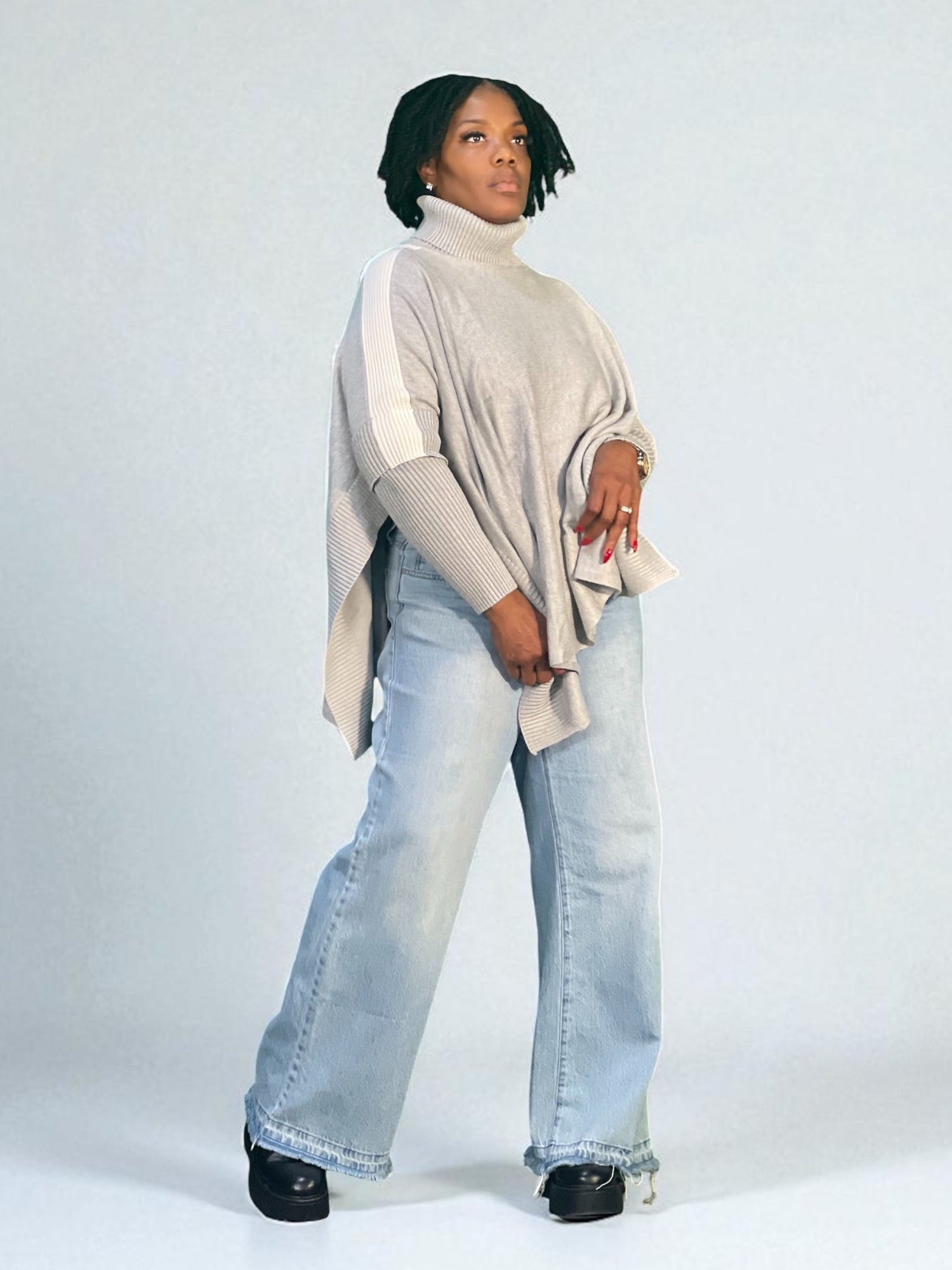 Stretch; pullover; turtleneck and long sleeves; high side split (open); Model is 5’4 wearing S/M