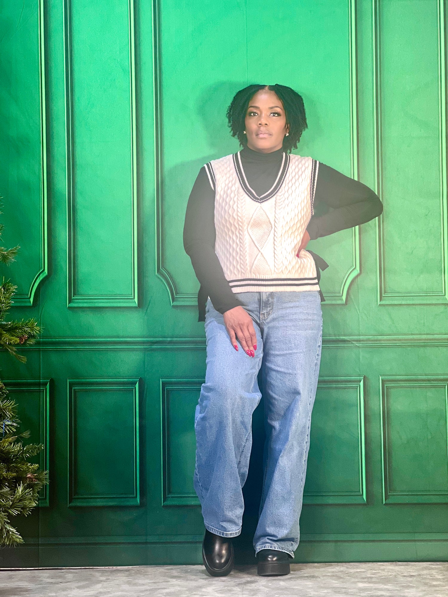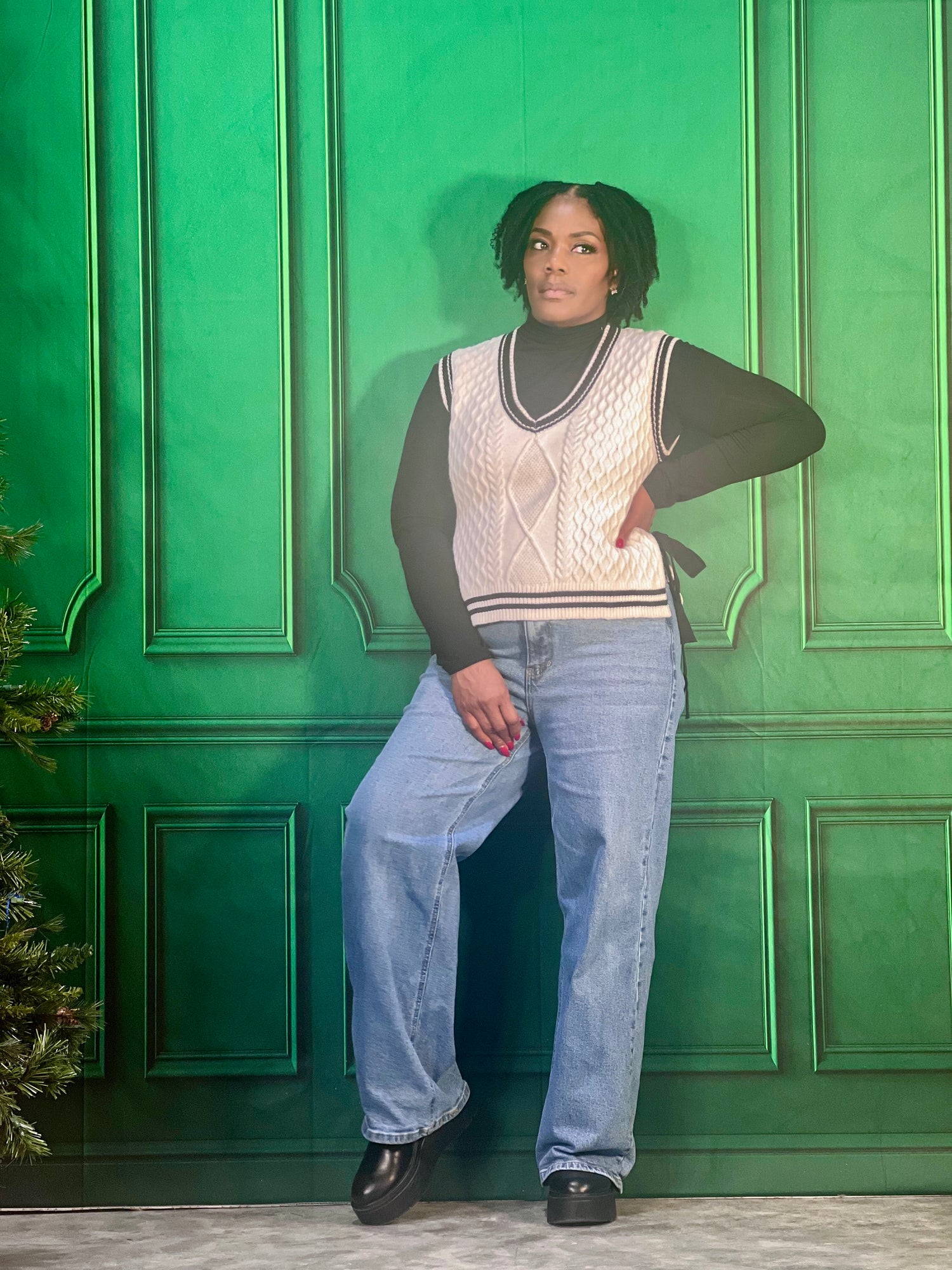 Stretch; pullover; sweater fabric; lower side tie; model is 5’4 wearing small