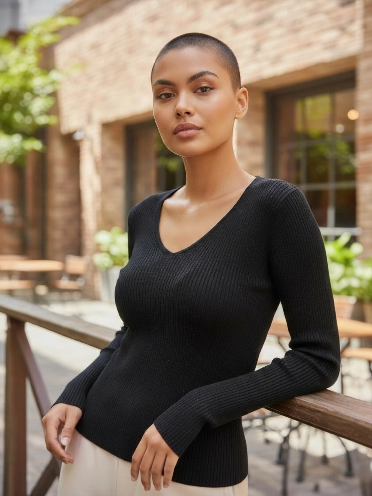 Stretch; pullover; shining specks; dainty and soft ribbed; slightly cropped; model is wearing small