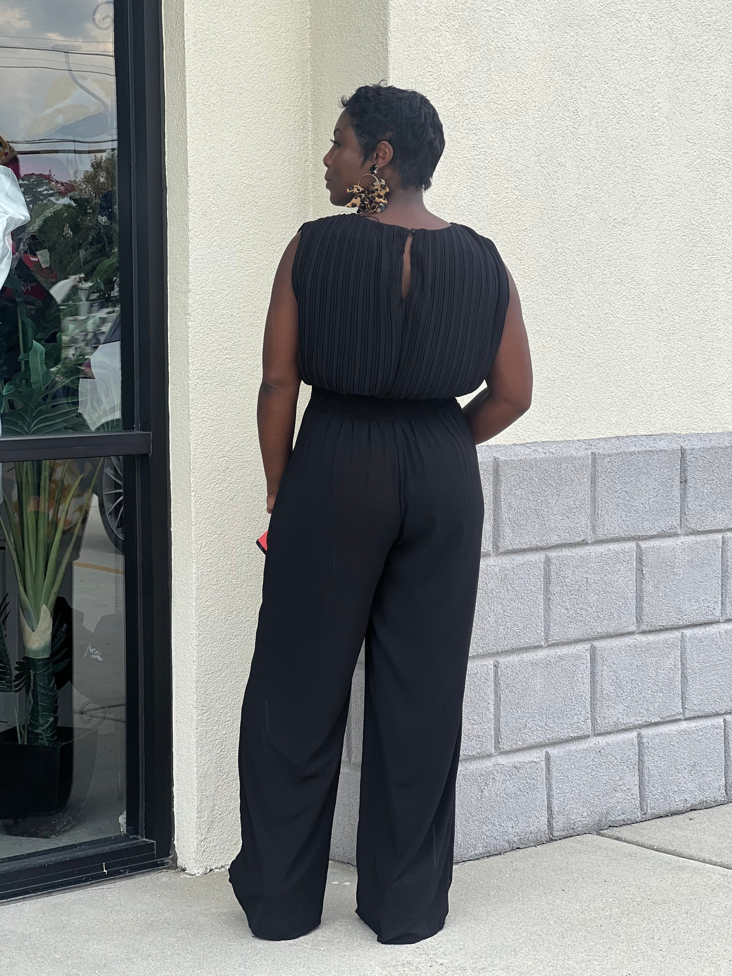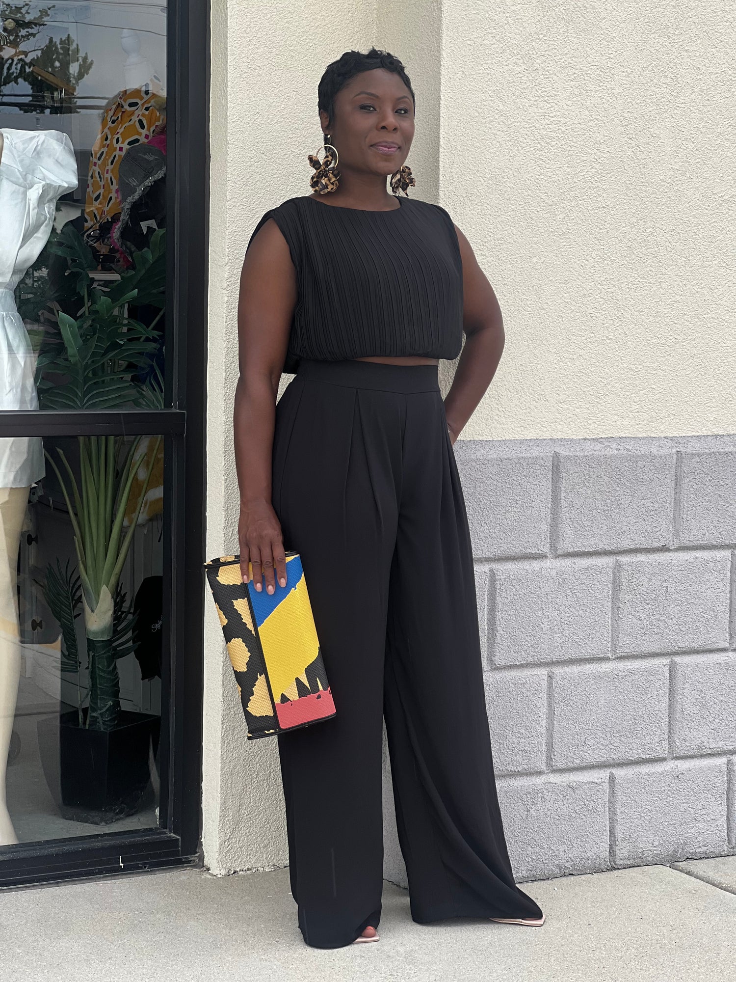 No stretch; elastic at the back of bottoms and flowing; both pieces are lined; top slightly cropped with upper back button; model is 5’4 wearing medium