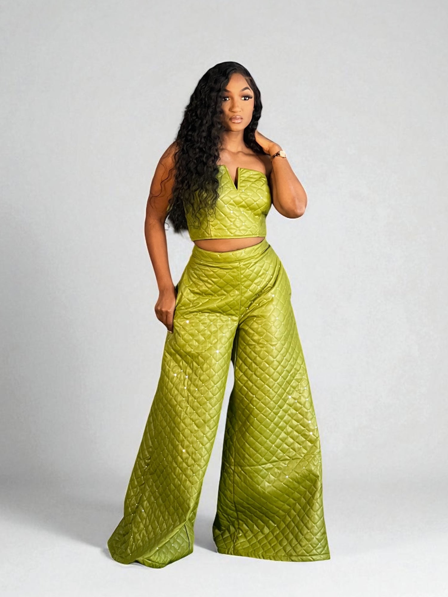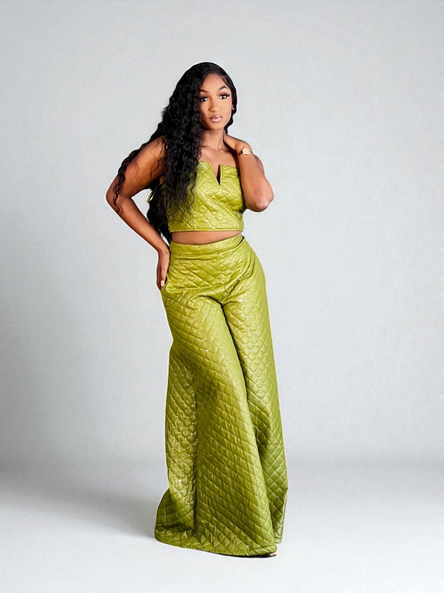 No stretch; bustier with zipper back; pants with side zipper and pockets; model is wearing small
