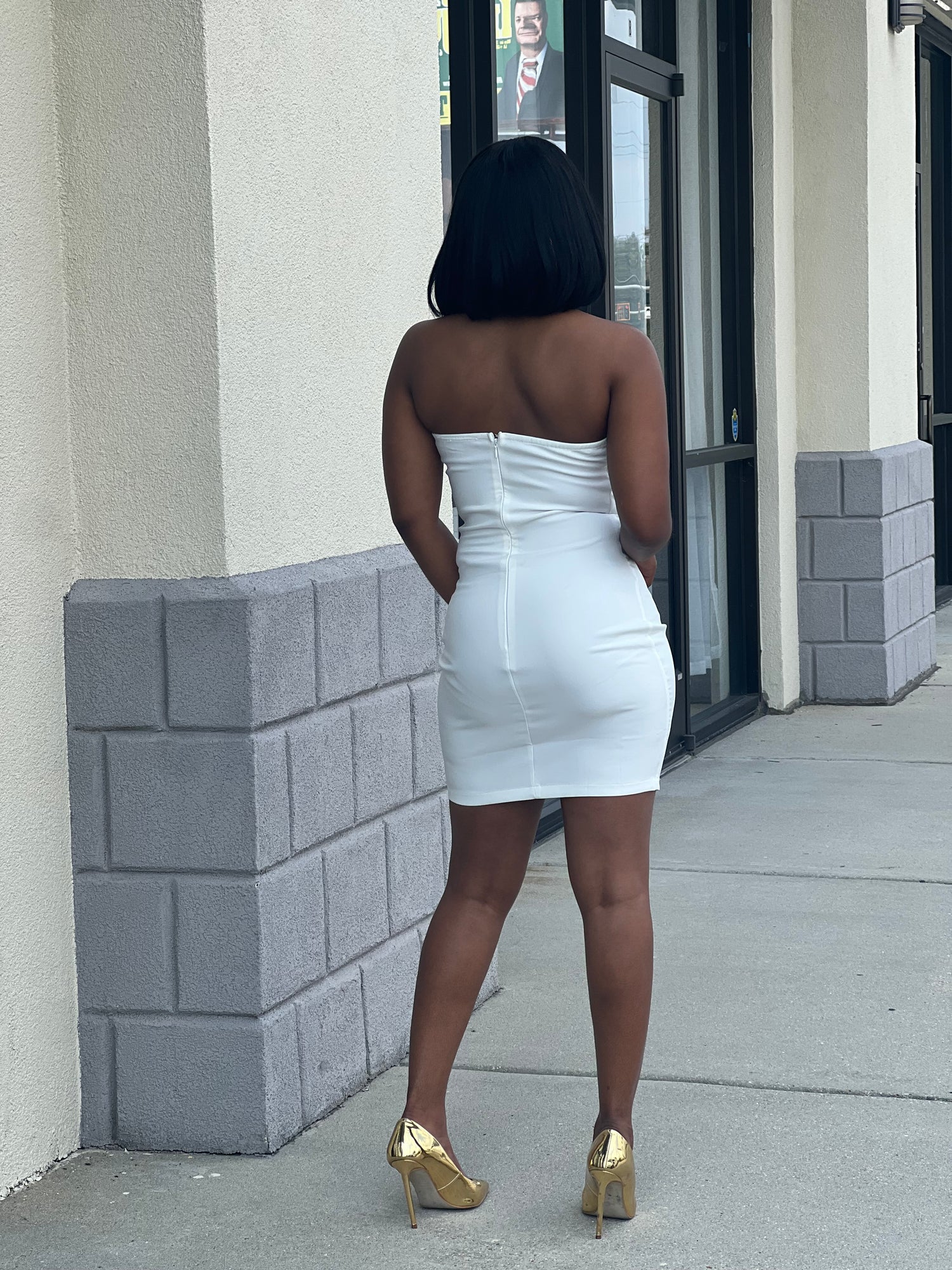 Little to no stretch; zipper back; strapless; model is 4’10 wearing small