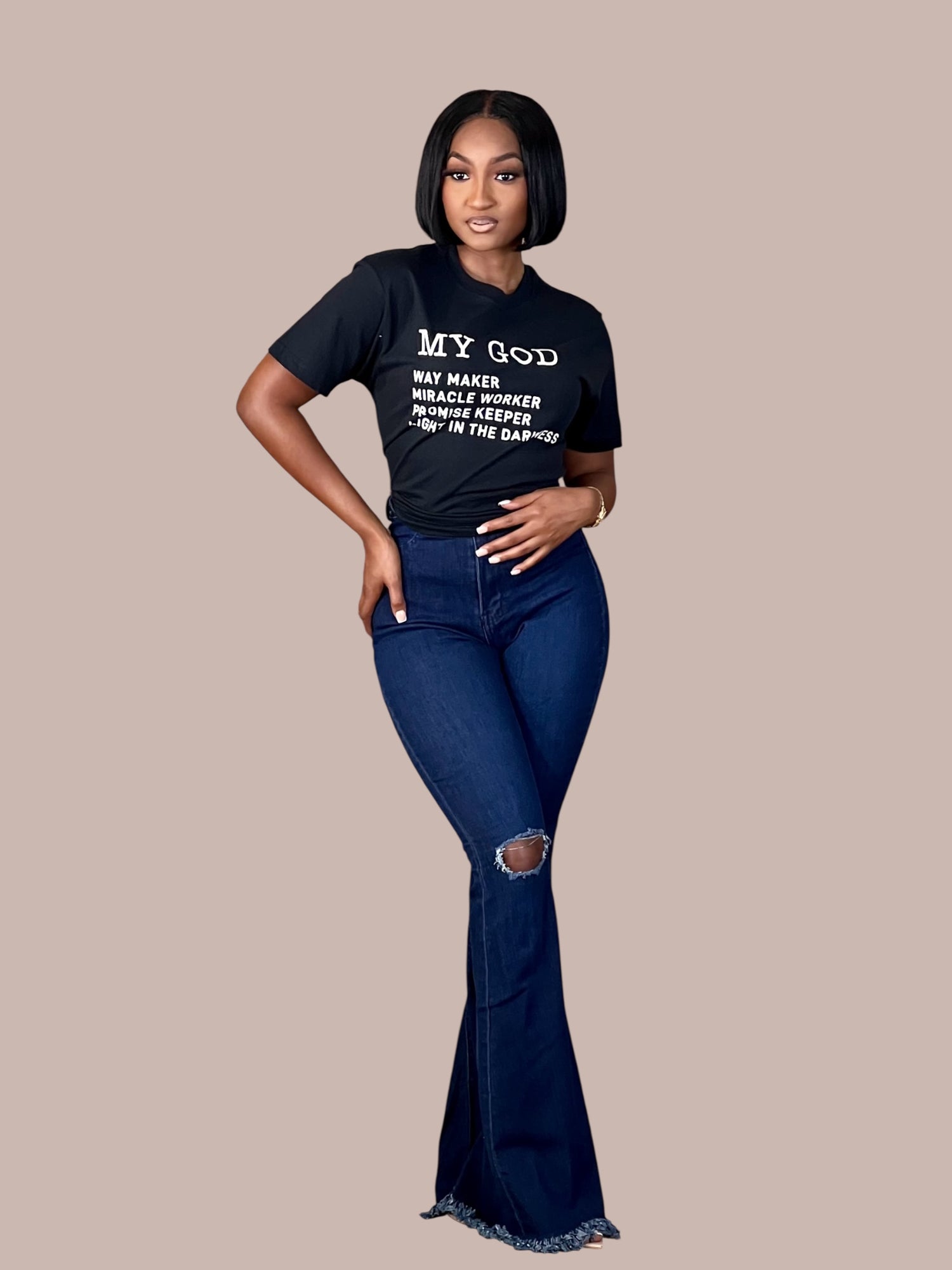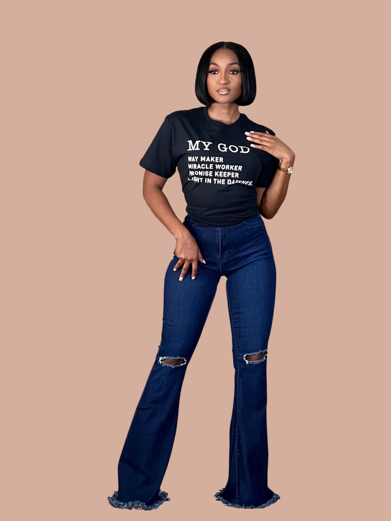 New Bell Bottom Distressed Hem Jeans-Dark Blue